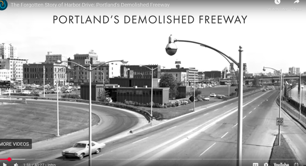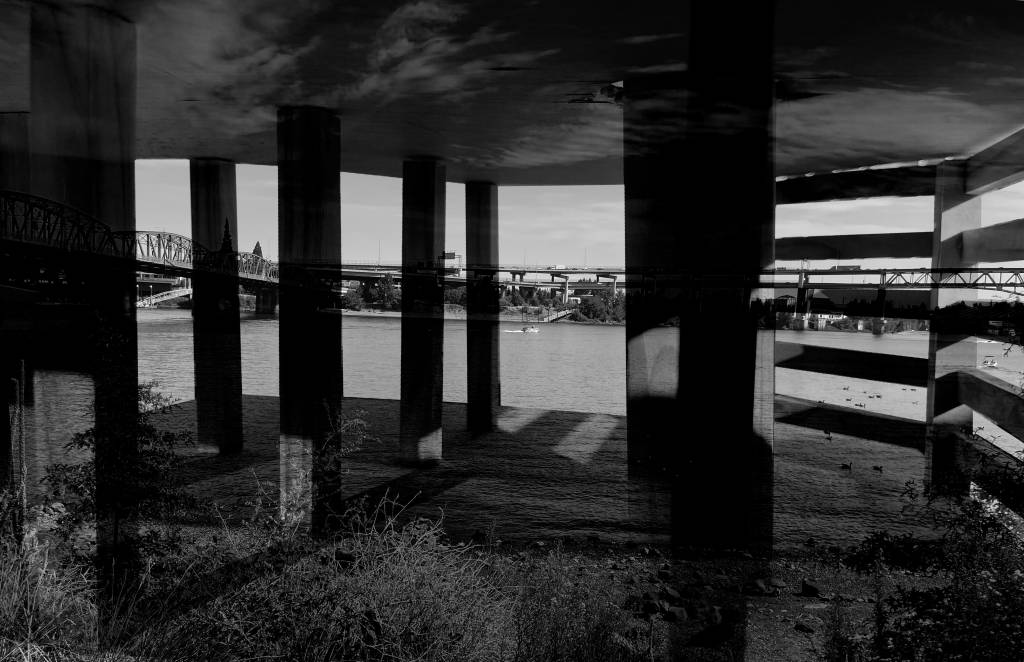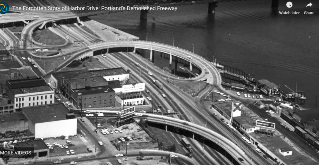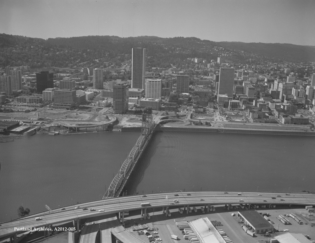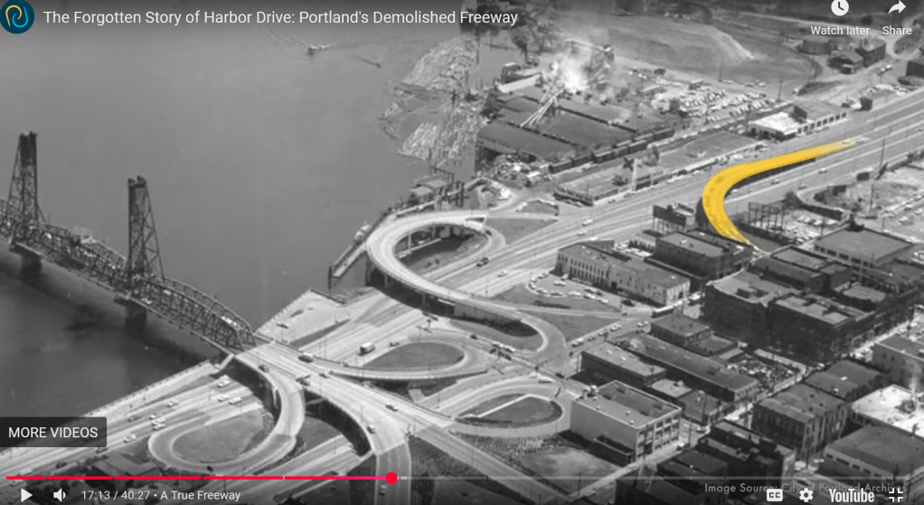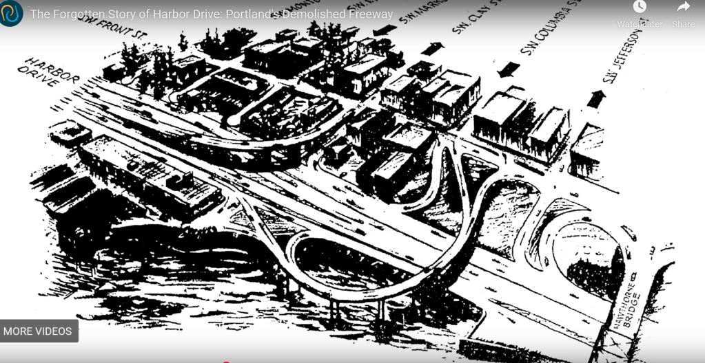 Here are images I gathered for the historical infrastructure layer: Chinook and Kalapuya longhouses all along the Columbia and Willamette waterfront in the early 1800s (first image), the first colonial-settler structures built after 1843 in what is today downtown portland (second image), the 1940s iconic cast-iron buildings all along Front Avenue which were demolished to make way for what became Harbor Drive Highway (third image), Harbor Drive highway existed from 1940-1973 (images 4-9). In the 1970s the freeway was demolished and since 1973 that site is Waterfront Park. Sitting in the park today, it is difficult to feel that – all of its iterations throughout time. Really, what is beneath the grass is an immense amount of industrial fill and manufactured underdevelopment.